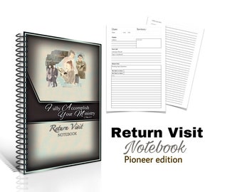 JW Theme. Return Visit - notebook. Fully programmed form sheets. White pages w/ black text. 5.5”x8.50” Spiral coils #Pioneer edition